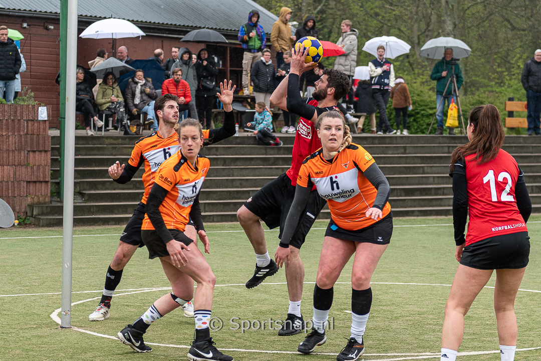 KVS/Groeneveld Keukens begon de wedstrijd voortvarend en bouwde een kleine voorsprong op. Maar het kwam bij de Scheveningers niet echt lekker op gang terwijl Pernix met fysiek spel van zich af begon te bijten. De Leidenaren vochten zich terug in de wedstrijd en kwamen zelfs een moment op voorsprong. Maar KVS herstelde zich en ging met een voorsprong van 9-7 de rust in.
