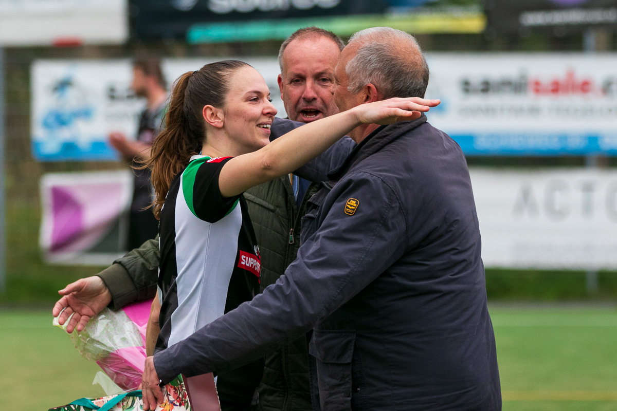 Heel vaak is het Mariska die na rust de eerste goal maakt en zo ook vandaag. Dus gaatje van 3 in het voordeel van Achilles. En bij onze Mariska, die zwanger is en verderop in de wedstrijd met een publiekswissel (voorlopig?) afscheid nam, wil ik even kort stilstaan. Ik schat dat Mariska (met onderbreking van een periode waarin ze moest revalideren van een stevige blessure) ruim 10 jaar op selectieniveau actief was voor Achilles. Met haar snelheid en positieve houding was Mariska een zeer stabiele en regelmatig ook bepalende factor in Achilles 1. Onlangs in de zaal tegen KVZ thuis speelde ze nog een weergaloze wedstrijd. Met de jaren werd onze routinier eigenlijk alleen maar beter. Achilles 1 gaat je (binnen de lijnen) missen en we wensen jou en Stijn een mooie tijd.